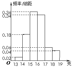 一批产品抽50件测试,其净重介于13克与19克之间,将测试结果按如下方式分成六组:第一组,净重大于等于13克且小于14克;第二组,净重大于等于14克且小于15克;……第六组,净重大于等于18克且小于19克.如图是按上述分组方法得到的频率分布直方图.设净重小于17克的产品数占抽取数的百分比为