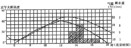 下图为某地某日正午太阳高度变化曲线、气温曲线和降水柱状图。读图回答23-25题: