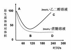 用2 mol·L-1的乙二醇溶液和2 mol·L-1的蔗糖溶液分别浸浴某种植物细胞,观察质壁分离现象,得到其原生质体体积变化情况如下图所示。下列表述中正确的是 ( )