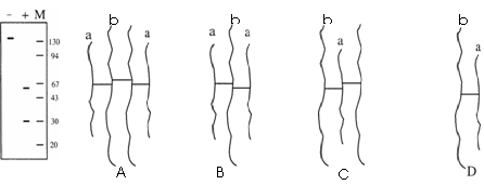 46.细菌蛋白质在极端环境条件下可通过肽链之间的二硫键维持稳定。已知不同的多肽产物可因分子量不同而以电泳方式分离。下列左图是一个分析细菌蛋白的电泳结果图,“-”代表没加还原剂,“+”代表加有还原剂,还原剂可打断二硫键,“M”代表某些已知分子量的蛋白质或多肽,M右侧的数字代表这些蛋白质或多肽的相对分子量。右图中的“-”代表二硫键。根据左侧结果,右图中最能代表该细菌蛋白质结构的是 ( )