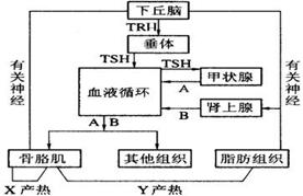 (2)寒冷环境中 A和B激素在血液中的含量________,作用于骨胳肌和其他组织后,形成Y产热的原因是________。