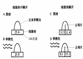 (1)20世纪20年代就有科学家认为,生长素(IAA)在向光和背光两侧分布不均是造成向光性的原因。那么,这种分布不均,是由于单侧光破坏了向光侧的IAA造成的,还是IAA在向光和背光两侧重新分配造成的呢?有人做了如下图所示的实验: