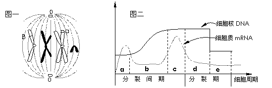 (7分)下图一是某生物有丝分裂过程中的某时期分裂图像,图二是分裂各阶段细胞的核DNA和细胞质中信使RNA含量的变化曲线。试回答下列有关问题:
