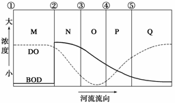 (2008·宁夏文综)溶解氧DO是指溶解于水中的氧的含量,是衡量水质的重要指标。生化需氧量BOD是微生物分解水中的有机物体时需要消耗氧的数量,它用于监测水体有机物的污染状况。下图为某河由M河段至Q河段水中溶解氧和生化需氧量浓度变化曲线。据此完成12-13题。