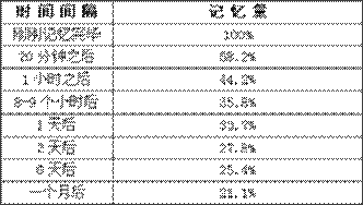 输入的信息在经过人的注意过程的学习后,便成为了人的短时的记忆,但是如果不经过及时的复习,这些记住过的东西就会遗忘,而经过了及时的复习,这些短时的记忆就会成为了人的一种长时的记忆,从而在大脑中保持着很长的时间。那么,对于我们来讲,怎样才叫做遗忘呢,所谓遗忘就是我们对于曾经记忆过的东西不能再认起来,也不能回忆起来,或者是错误的再认和错误的回忆,这些都是遗忘。艾宾浩斯在做这个实验的时候是拿自己作为测试对象的,他得出了一些关于记忆的结论。他选用了一些根本没有意义的音节,也就是那些不能拼出单词来的众多字母的组合,比如asww,cfhhj,ijikmb,rfyjbc等等。他经过对自己的测试,得到了一些数据(如图2)。然后,艾宾浩斯又根据了这些点描绘出了一条曲线,这就是非常有名的揭示遗忘规律的曲线(如图3):艾宾浩斯遗忘曲线。图中竖轴表示学习中记住的知识数量,横轴表示时间(天数),曲线表示记忆量变化的规律。