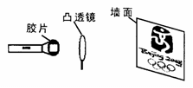 (08中)25、小明自制了一个简易投影仪(如图),在暗室中将印有奥运五环(红、黄、蓝、绿、黑五色环)标志的透明胶片,贴在发白光的手电筒上,并正对着焦距为10cm 的凸透镜。调整手电筒、凸透镜、白色墙壁之间的位置,在墙上得到了一个清晰正立放大的像,下列说法错误的是: