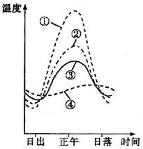 19、下图表示不同地物辐射温度在一天内的变化状况。则曲线①-④代表的地物分别可能是( )