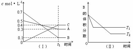 17.T℃时,A气体与B气体反应生成C气体。反应过程中A、B、C浓度变化如图(Ⅰ)所示,若保持其他条件不变,温度分别为T1和T2时,B的体积分数与时间的关系如图(Ⅱ)所示,则下列结论正确的是