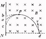 2. 如图所示,匀强磁场的方向垂直纸面向里,一带电微粒从磁场边界d点垂直与磁场方向射入,沿曲线dpa打到屏MN上的a点,通过pa段用时为t