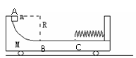 质量为M的小车置于水平面上。小车的上表面由1/4圆弧和平面组成,车的右端固定有一不计质量的弹簧,圆弧AB部分光滑,半径为R,平面BC部分粗糙,长为