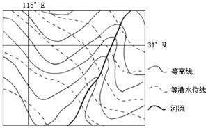 右下图为某地区1月份等潜水位线图,读图回答20-21题。