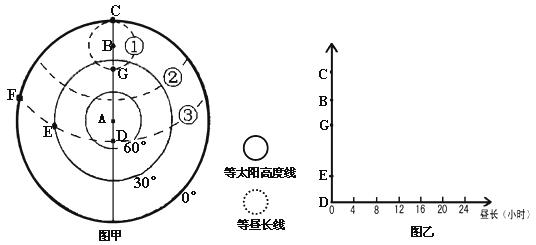 (4)若此时F点地方时为6时,在图乙中画出DE线和GBC线此日的昼长变化折线图。(2分)
