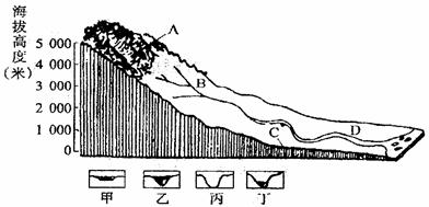27.读河流发育过程模式图,甲、乙、丙、丁分别表示该河A、B、C、D各点的河谷横断面。读图完成下列问题。(10分)
