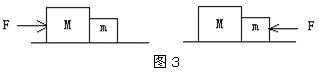 3.如图3所示,在光滑水平面上,有两个相互接触的物体,若M>m,第一次用水平力F由左向右推M,两物体间的作用力为N1,第二次用同样大小的水平力F由右向左推m,两物体间的作用力为N2,则( C )