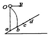 5、如图所示,斜面上有a、b、c、d四个点,ab=bc=cd。从a点正上方的O点以速度V水平抛出一个小球,它落在斜面上的b点。若小球从O点以速度2V水平抛出,不计空气阻力,则它落在斜面上的:( )![]()