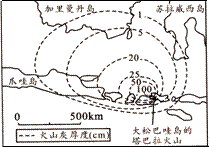 下图表示1815年印度尼西亚大松巴哇岛的塔巴拉火山爆发后火山灰厚度的分布,回答第10题![]()
