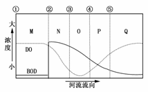 (2008·宁夏)溶解氧DO是指溶解于水中的氧的含量,是衡量水质的重要指标。生化需氧量BOD是微生物分解水中的有机物体时需要消耗氧的数量,它用于监测水体有机物的污染状况。下图为某河由M河段至Q河段水中溶解氧和生化需氧量浓度变化曲线。据此完成14-15题。