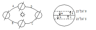 C.晨昏线与地轴重合 D.太阳直射点上入射光线的延长线过地心且与赤道平面有23°26′的夹角