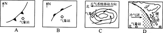 10.下列示意图能正确反映气象观测点在1月1日时的天气形势的是 ( )