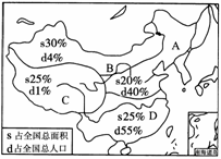 (1)由图中数字可知,四大区中人口密度最小的地区是 地区(填字母)。