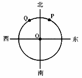 一半径小于竹竿的圆,当竹竿影端落在圆周上时,做两个标记,并记录下时间,如图所示(O为竹竿的位置,P、Q为12:20和15:40时影端在圆周上的位置)。读图回答26-28题。