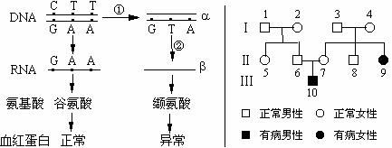 28.下面左图表示人类镰刀型细胞贫血症的病因,右图是一个家族中该病的遗传系谱图(控制基因为B与b),请据图回答:(已知谷氨酸的密码子是GAA、GAG)