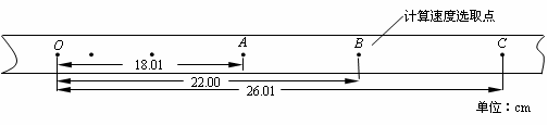 下图是实验中得到的一条纸带,点O为纸带上的起始点,A、B、C是纸带的三个计数点,相邻两个计数点间均有4个点未画出,用刻度尺测得A、B、C到O的距离如图所示,已知所用交变电源的频率为50Hz,问: