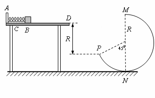 (13分)如图所示,水平桌面上有一轻弹簧,左端固定在A点,弹簧处于自然状态时其右端位于B点。水平桌面右侧有一竖直放置的光滑轨道MNP,其形状为半径R=0.8 m的圆环剪去了左上角135°的圆弧,MN为其竖直直径,P点到桌面的竖直距离也是R。用质量m1=0.4kg的物块将弹簧缓慢压缩到C点,释放后弹簧恢复原长时物块恰停止在B点。用同种材料、质量为m2=0.2kg的物块将弹簧也缓慢压缩到C点释放,物块过B点后其位移与时间的关系为