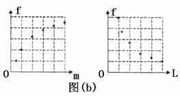 2.(10分)将n根相同的弦一端固定,在另一端系着不同质量的小物体,让其自然下垂,使弦绷紧,做成如图(a)所示的装置。用工具拨动弦AB的中点,使其振动,进行实验,研究其振动频率f与小物体质量m及AB弦的长度L的关系,具体做法是:只让m或只让L变化,测定振动频率f,得到图(b)所示的两个图像。