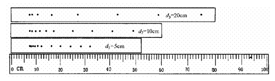 打点计时器电源频率为50Hz,实验共做了三次,各次小车由静止开始运动的位置不同(即橡皮筋的拉长量d不同),分别打出的纸带的局部如下图所示(图中最下面的是直尺)。