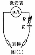 (2)在图(1)电路的基础上,不换微安表和电池、图(2)的刻度也不改变,仅增加1个元件,就能改装成“R×1”的欧姆表。增加的元件是 ,规格为 (保留两位有效数字).在答题卡相应的方框中画出电路图。