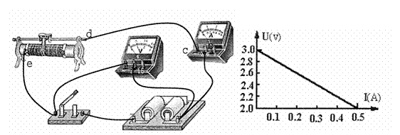 (2)(8分)如图所示,在测电池的电动势和内电阻的实验中,接通开关,电压表有读数,电流表示数为零。改变变阻器滑片的位置,电流表也没有反应。用多用表电压档检查电路,把红表笔接到电池的正极,黑表笔分别接触电流表的正极(b点)和负极(c点),多用表电压档的示数均零;用黑表笔分别接触d点、e点,多用表电压档的示数均和电压表示数相等。检查各接线柱选择均正确且接触良好,则电路中发生故障的原因是 。故障排除后,根据得出的数据作出的U-I图象,如图所示,由图象得出电池的电动势E= V,内电阻r= Ω.