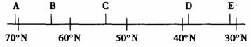 下图是地球仪上的一段经线,其中A点以北是海洋,E点以南是陆地; B与C之间.D与E之间为海域; A 与 B之间, C与 D之间为陆地。据此回答37-38题。