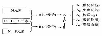 下图是人体细胞内两种重要有机物A、B的元素组成、相互关系及功能示意图,请分析并回答下面问题。(每空2分,共14分。)