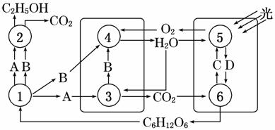 (1)图中代表暗反应的是 ,代表有氧呼吸第二阶段的是 ,A、B代表的物质分别是 和 。