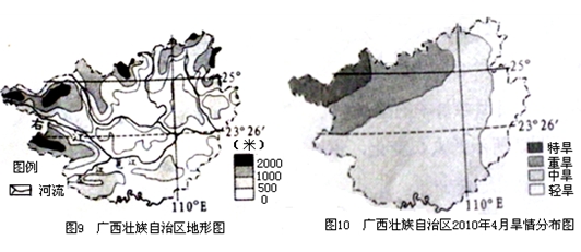 (3)据图10描述广西旱情的空间分布特点: ;请列举两项影响广西旱情分布的自然原因。