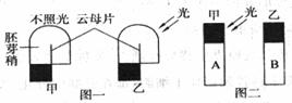 9. 燕麦胚芽鞘经如下图一所示处理,-段时间后,取其甲、乙两块琼脂,置于已切去尖端的胚芽鞘A、B上,A以单侧光照处理如图二所示。则弯曲程度 ( )