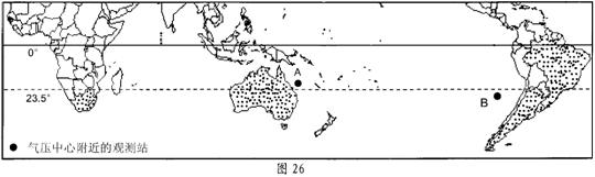 (2) 近几年来,澳大利亚遭遇“百年大旱”。依据材料三中厄尔尼诺发生期A、B两地气压变动规律,从大气环流角度解释导致澳大利亚气候干旱的原因。(6分)