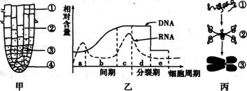 18. (2009湖北宜昌)下图中甲表示洋葱根尖的不同区域;乙表示洋葱根尖处于有丝分裂各阶段细胞核中DNA和细胞质中mRNA含量变化;丙呈现的是细胞分裂过程中的一种物质变化和形态变化。