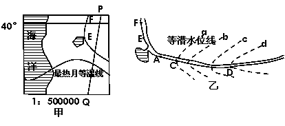 下面甲图中PQ为晨昏线,乙图是甲图中的对应河段及其附近的等潜水位线图,丙图中的年径流量曲线图是从乙图中A、E两处测得的,读图回答6-8题。