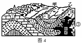 C.①处比②处更不易被侵蚀 D.③ 处可能为花岗岩,④ 处可能为安山岩