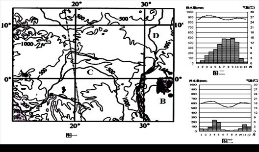 40.读某大洲部分地区地形图(图一),气候资料图(图二、图三),回答问题(28分)