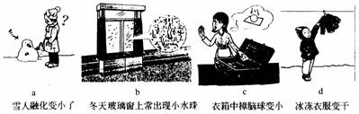 思路与技巧 从图中情景可以看出a c d中物质“雪、冰、樟脑”都是由固态直接变成气态,属升华现象;而b图中则出现液态的“小水珠”属液化.
