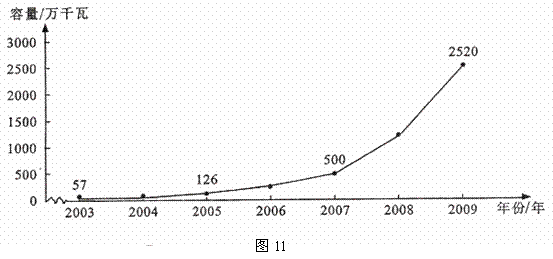 目前,“低碳”已成为保护地球环境的热门话题.风能是一种清洁能源,近几年我国风电装机容量迅速增长.图11是我国2003年-2009年部分年份的内力发电装机容量统计图(单位:万千瓦),观察统计图解答下列问题.