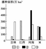 右图显示我国四个省2009年三种谷物的种植面积。读下图,回答31-32题。