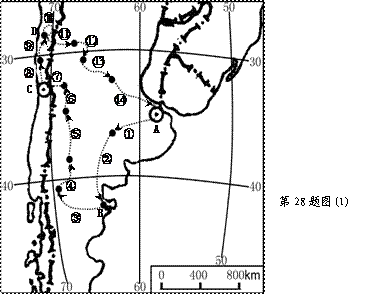 2009年达喀尔拉力赛于2009年1月3日在下图(1)所示大洲A城发车,于1月18日返回A城,比赛全程9574千米,共分成14个赛段,图(1)中的箭头为比赛路线,读图回答下列问题。(9分)