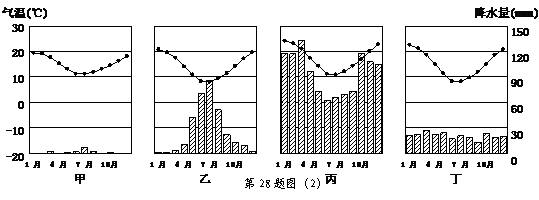 (3)在图(2)中表示B城的气候资料图是_______图,形成该地降水特征的主要原因是_______。(3分)