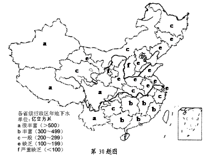 30.下图为“中国各省级行政区地下水资源分布图”,读图回答下列问题。(16分)