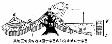 28.读“某地区地质构造剖面示意图和部分水循环示意图”,并回答下列问题。(12分)