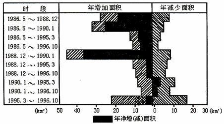 (2)说明该期间黄河三角洲陆地面积的增减变化特点